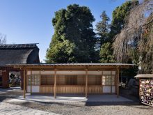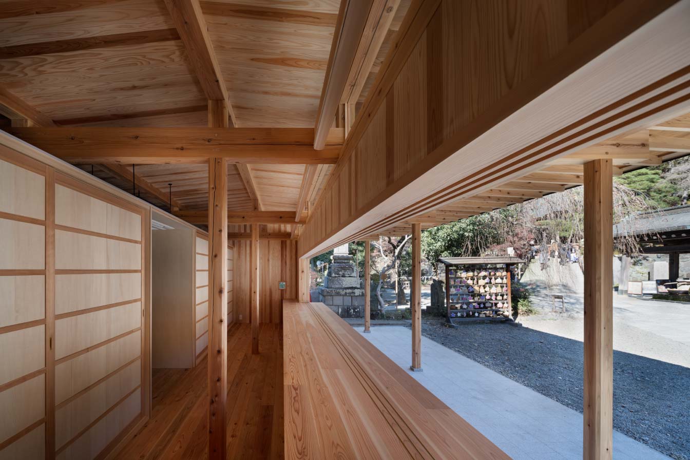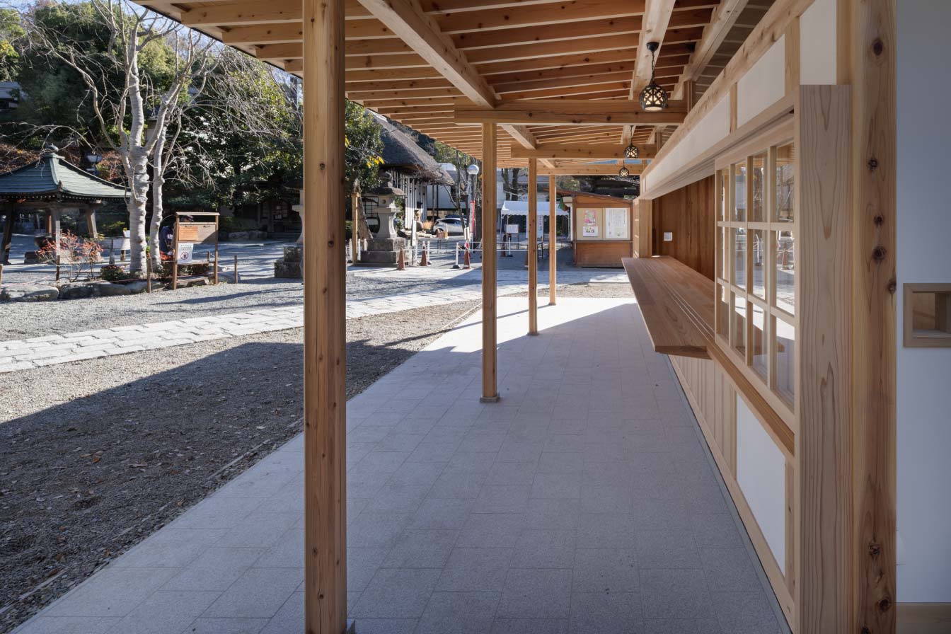 開創1300年記念事業の一環として、授与所建替え工事落慶。境内山門脇に低く小さく佇む。開放型参拝者溜まり含め、床面15坪の平屋にまとめる。内外真壁にしながら、軸架構をそっくり現す骨美人にしたつもり。歴史的建造物群の中にあり、耐久力に劣る事の無いよう天乾材は譲れない。土台回りを桧にしながら、板材含め他全て杉材を調達。、葉枯らし天然乾燥材を生産している天竜の山に委ねる。一方、使い勝手は要になる授与台廻りの吟味。朱印所を兼ねることから間口4間半中、開口幅3間半を確保した。仕切り硝子障子戸を両袖に引き込めば無柱ワイド開口が解放感を引き立てるはず。授与処床は上がり板の間とし、バックヤード保管処から下足履き土間とした。授与物搬入出の多い作業が効率よく捌けることと、係員立ち振る舞いの意識転換的結界として身体尺に馴染んでほしい。小さな授与所窓先の、目一杯広げた笠の下、大勢の参拝者が集う賑わいが、新たな境内の風物詩に加わることを願う。