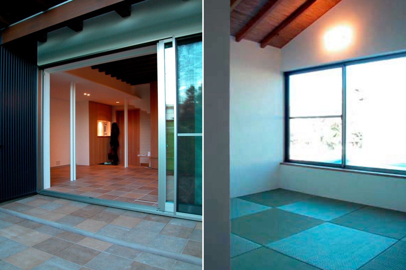 八方隣家の壁で遮られた旗竿地。必須条件は空を味方にした壁面開口部の設え方。更に、隣家壁の借景的利用法を間取りに確実に反映させること。一見アバウトな間取りやTileフロア等、いまだけの見栄えなどではない。限りある場所のフル活用を促す為、内外どこでもリビング空間づくりのベーシックと捉えての試みである。