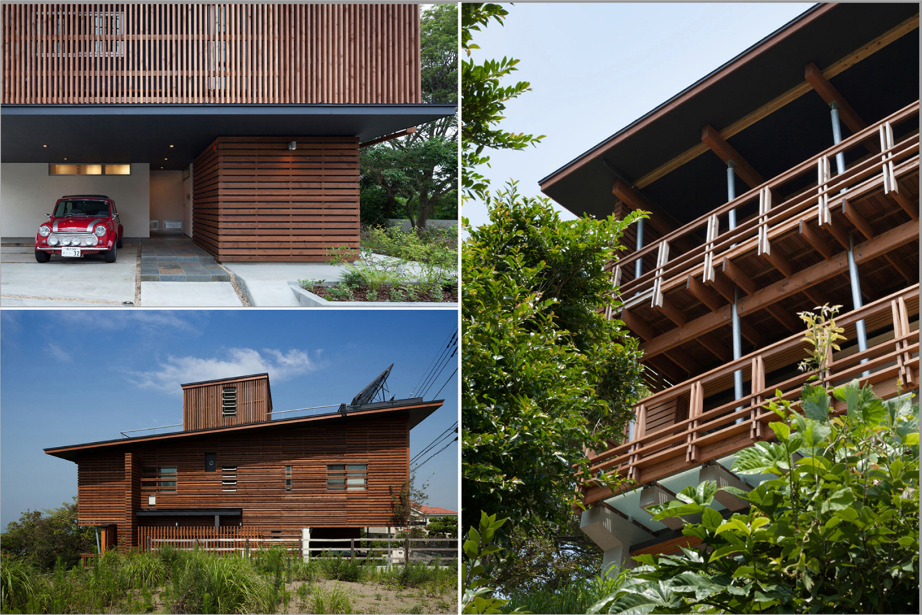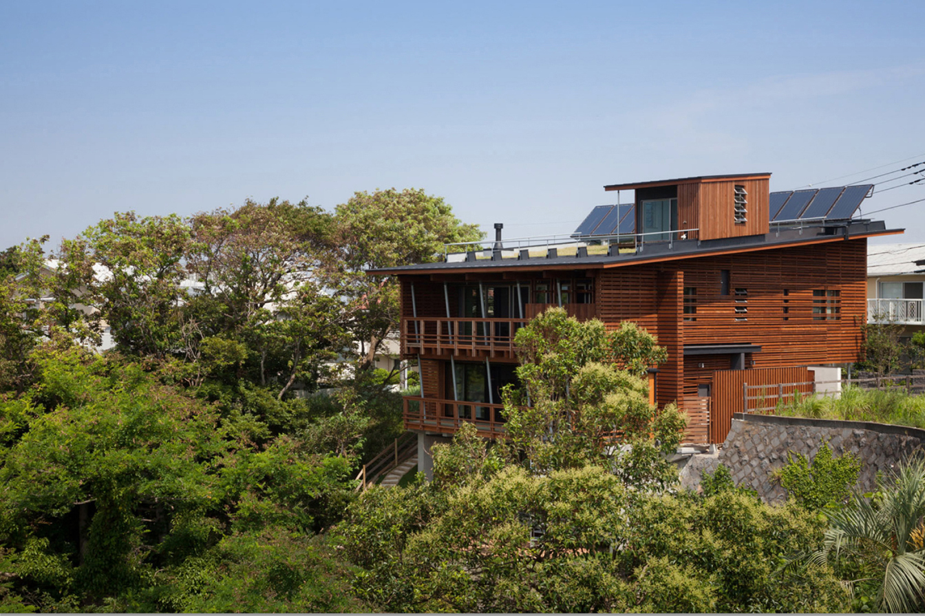 やがて富士のスカイラインとひとつの風景になる。その環境を余すことなくフレームに納めるため、耐力壁を外に追い出しながら、テラス間戸を家の間口一杯に開け放した。圧巻は谷側に緩やかに流れた一枚大屋根。50畳敷きの芝庭が、眺望縁台として、あるいは創エネ畑として空の間取りも充実させている。簀の子板壁によって被覆された外壁とともに、片瀬山の風致に包み込まれる環境建築づくりをめざした。
